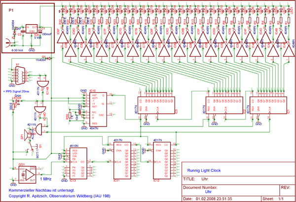 Von einem GPS Empfänger (hier Garmin GPS18 LVC) der an einen Videotimeinserter angeschlossen ist wird der PPS Impuls ausgekoppelt und in eine "Running Light Clock" eingespeist. Mit der Startflanke des PPS beginnend wird in dem LED Display jede Millisekunde die Zeit hochgezählt. Damit werden alle Werte von 000 bis 999ms angezeigt. Die CCD Kamera nimmt nun die Stellung der LEDs auf. Da die SXV-H9 bis herunter zu 1/1000 Sekunde belichtet ist im besten Fall jeweils nur eine LED pro Position im beleuchteten Zustand.